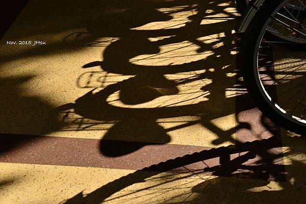 我吃飯很慢,尤其沒事一個人用餐更慢。離開餐廳往烏桕走去時,已近下午3點鐘,日頭打進騎樓裡有些斜度了,這一列腳踏車影子很有意思。